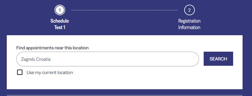 - Your location: Before opening the scheduling calendar, you will be asked to provide your location or the location where you would like to take the test if you choose to go to the test center.