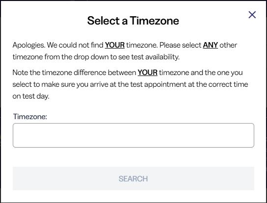 If the city you entered cannot be found, the system will prompt you to select your timezone to display available test center timeslots in your area.