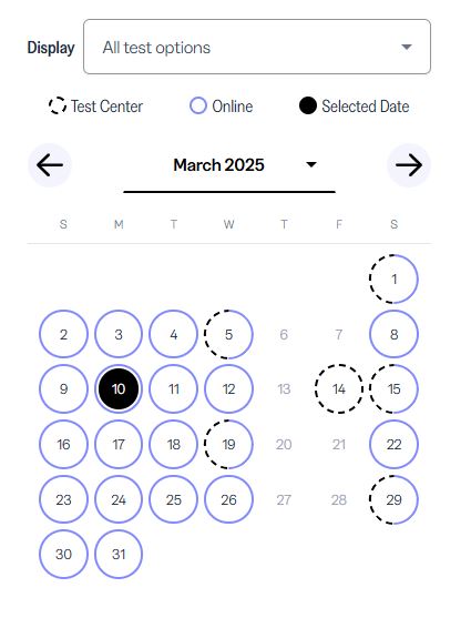 - Test Dates: Check for available test dates at your preferred test centers. Test center dates will be marked with a dotted line on the scheduling calendar. Clicking on one of these dates will show you the exact test center locations available that day.